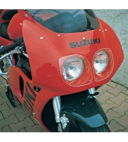 Carénage en 2 parties, tête de fourche double optiques avec flancs + sabot moteur, en fibres de polyester, livré brut de gel coat à peindre, renforcée aux points de fixation en roving, points de fixation repérés mais non percés...