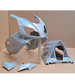 Carénage en 2 parties ,tête de fourche avec flancs + sabot moteur avec ou sans découpe du phare à sélectionner, sabot fermé pour la compétition, en fibre de polyester, livré brut de gel coat à peindre, renforcée aux points de fixation en roving, points de fixation repérés mais non percés.