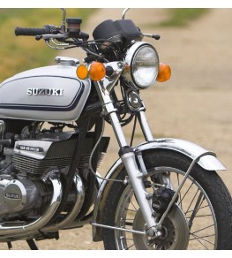 Garde boue avant type Suzuki 380 pour roue de 19 pouces, largeur pour le pneu 3.25 pouces maxi. En fibres de polyester. Livré brut de gel coat à peindre, renforcée aux points de fixation en roving, points de fixation non percés.