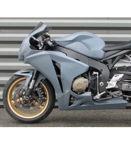 Carénage en 2 parties, tête de fourche avec flancs + sabot moteur fermé pour la piste, avec ou sans découpes de phares (à sélectionner sur la fiche produit), en fibres de polyester. Livré brut de gel coat à peindre, renforcée aux points de fixation en roving, points de fixation repérés mais non percés.
