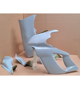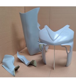 Carénage en 2 parties, tête de fourche avec (découpe pour le feu d'origine) ou sans découpe du phare avec flancs + sabot moteur fermé dessous pour la compétition, en fibres de polyester, livré brut de gel coat à peindre, renforcée aux points de fixation en roving, points de fixation repérés mais non percés...