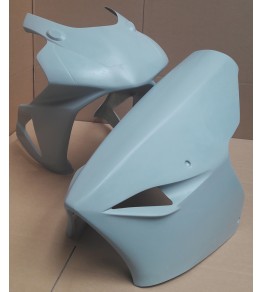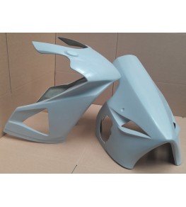 Carénage en 2 parties, tête de fourche avec flancs + sabot moteur fermé dessous pour la compétition, sans découpe de phare mais repéré, en fibres de polyester. Livré brut de gel coat à peindre, renforcée aux points de fixation en roving, points de fixation repérés mais non percés.