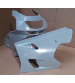 Carénage en 3 parties, coupe origine tête de fourche + 2 flancs, avec ou sans découpe de phare, en fibres de polyester, livré brut de gel coat à peindre, renforcée aux points de fixation en roving, points de fixation repérés mais non percés...