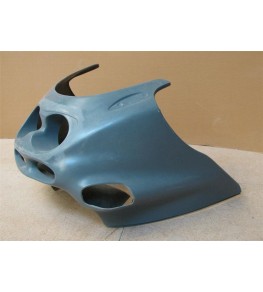 Carénage en 3 parties, tête de fourche + 2 flancs + entourage de compteur et instrumentations, avec découpe de phare rectangulaire d'origine ou en version double optiques (livré avec platine de fixations de phares + plexi, permet le montage de deux optiques en diamètre 120mm), à sélectionner sur la fiche produit. Livré brut de gel coat à peindre, renforcée aux points de fixation en roving, points de fixation repérés mais non percés.