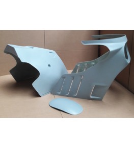 Carénage en 5 parties, tête de fourche + 2 flancs + sabot moteur en deux parties, coupe origine, en fibres de polyester, livré brut de gel coat à peindre, renforcée aux points de fixation en roving, points de fixation repérés mais non percés...