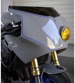 Tête de fourche Racer 1, pour vos préparation Racing, look agressif à monter avec optique(s) extérieur(s) ou simplement fermée pour un usage piste, se monte sur de nombreuses motos, en fibres de polyester, livré brut de gel coat à peindre, renforcée aux points de fixation en roving, points de fixation non percés...